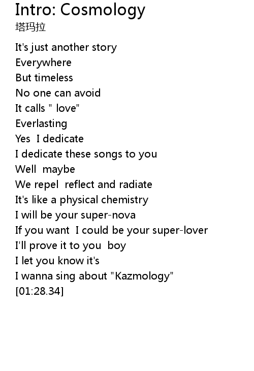 | [01:23.24] | I wanna sing about "Kazmology" |