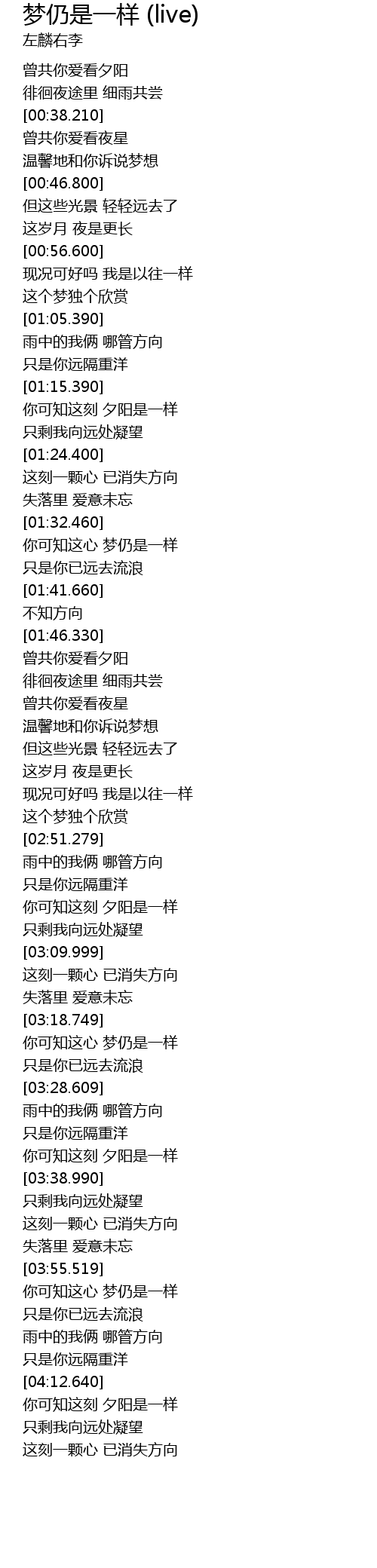 | [03:19.329] | nǐ kě zhī zhè xīn mèng réng shì yí yàng |