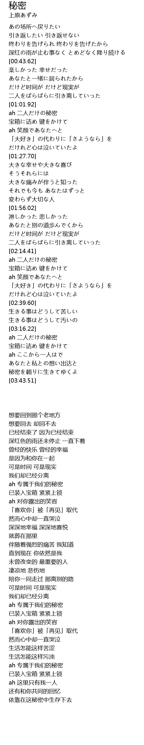 | [03:18.78] | ah 二人だけの秘密 |