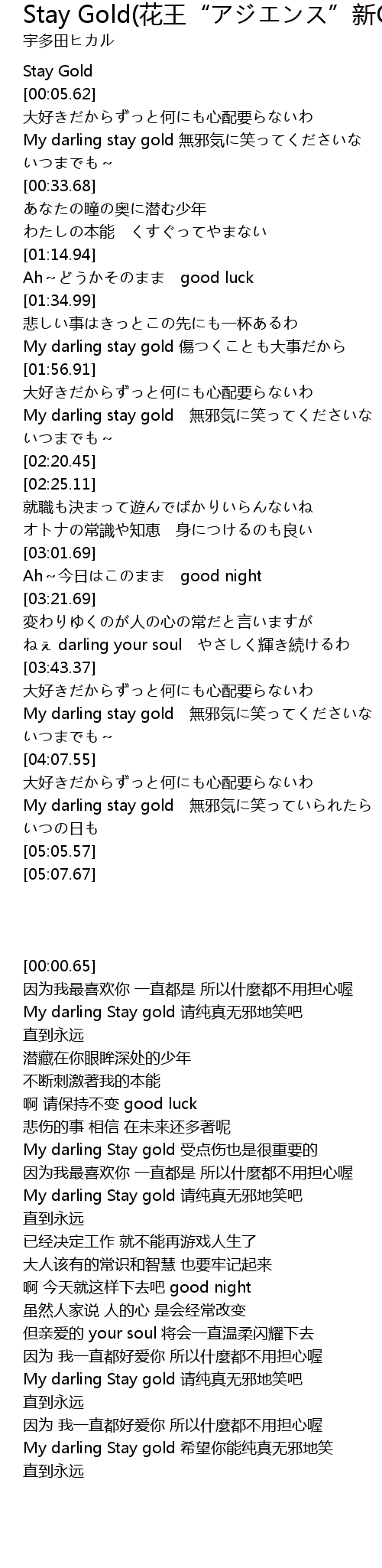| [00:20.56] | My darling stay gold 無邪気に笑ってくださいな |