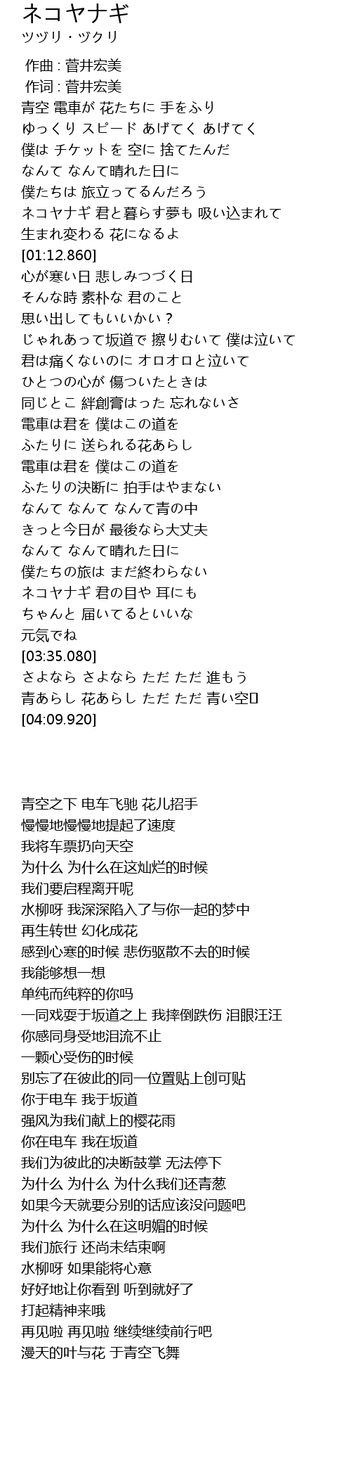 | [00:57.480] | ネコヤナギ 君と暮らす夢も 吸い込まれて |