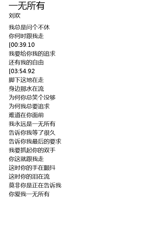 | [01:09.78][00:39.10][00:24.65] | 可你却总是笑我,一无所有 |