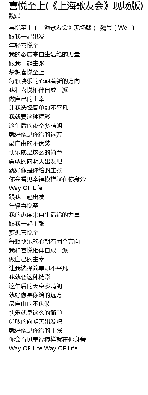 | [00:00.00] | 喜悦至上(上海歌友会》现场版)-魏晨(Wei ) |