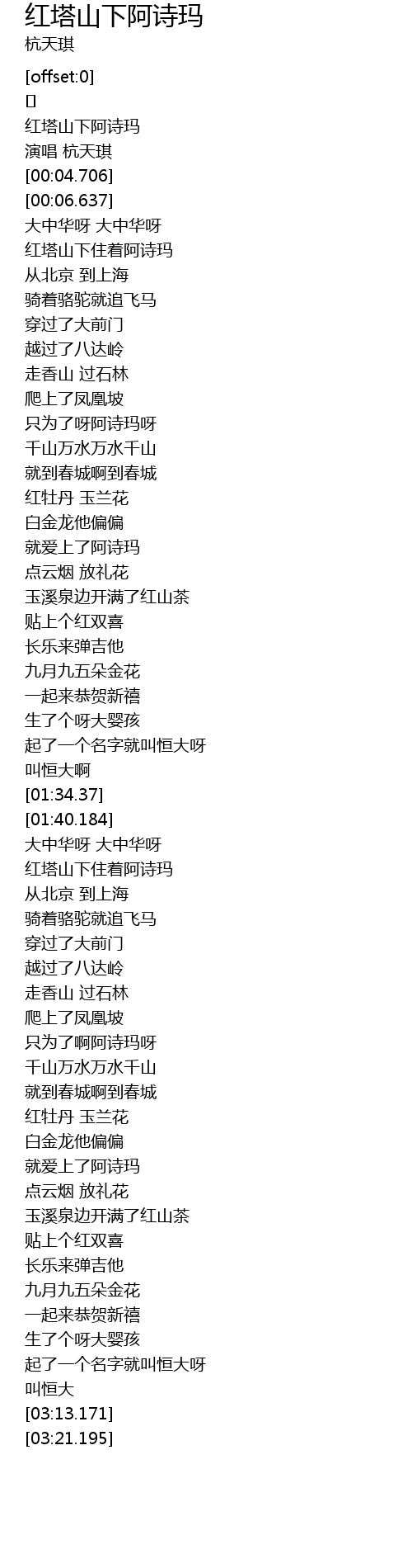 | [00:01.151] | 红塔山下阿诗玛 |
