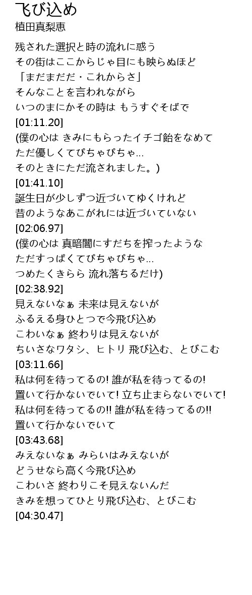 | [02:59.59] | ちいさなワタシ、ヒトリ 飛び込む、とびこむ |