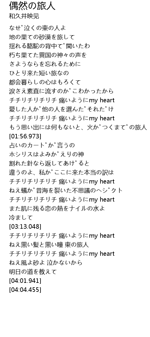 | [03:34.562] | ねえ黒い髪と黒い瞳 東の旅人 |