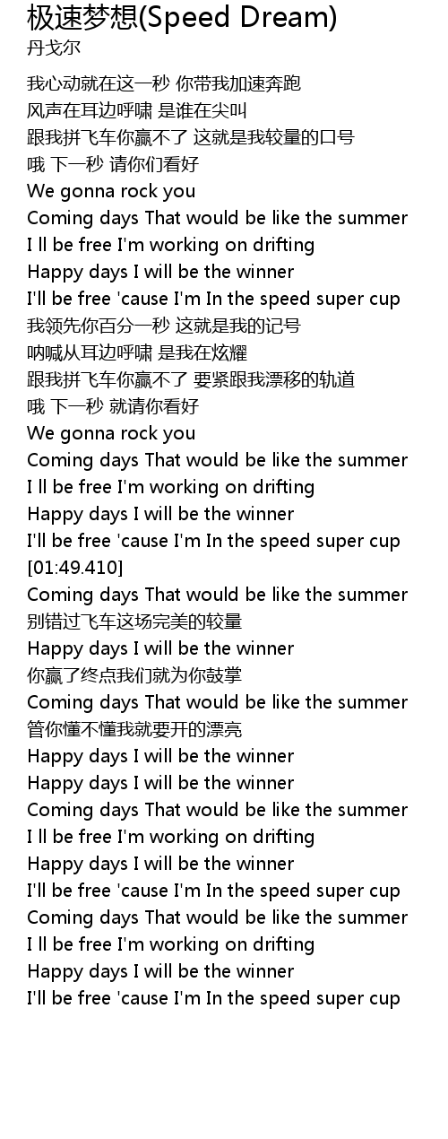 | [01:40.130] | I' ll be free ' cause I' m In the speed super cup |