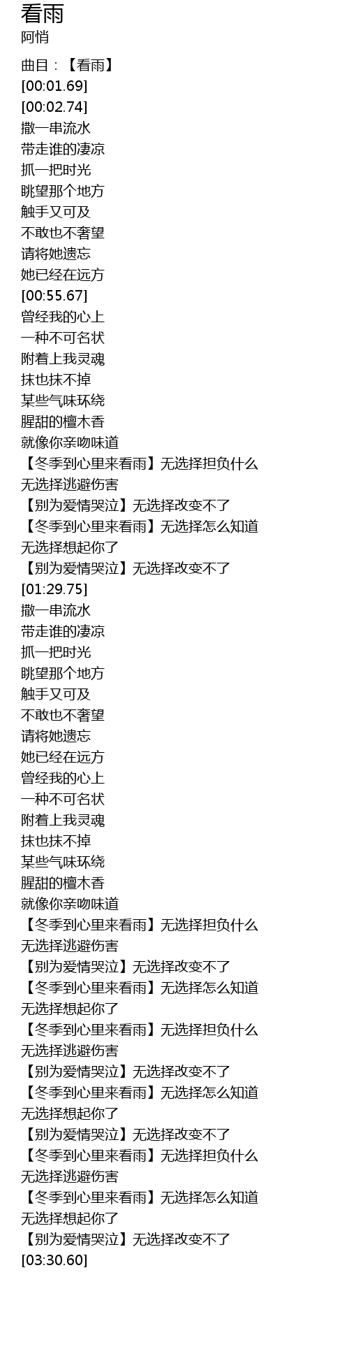 | [03:19.25] | 【冬季到心里来看雨】无选择怎么知道 无选择想起你了 |