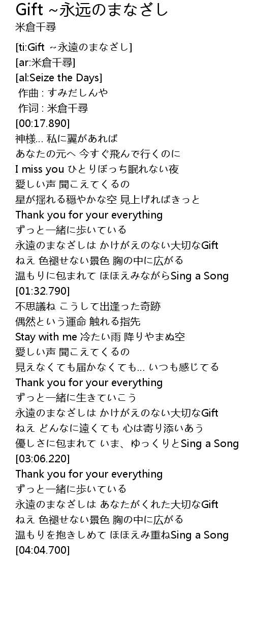 | [03:37.960] | 永遠のまなざしは あなたがくれた大切なGift |
