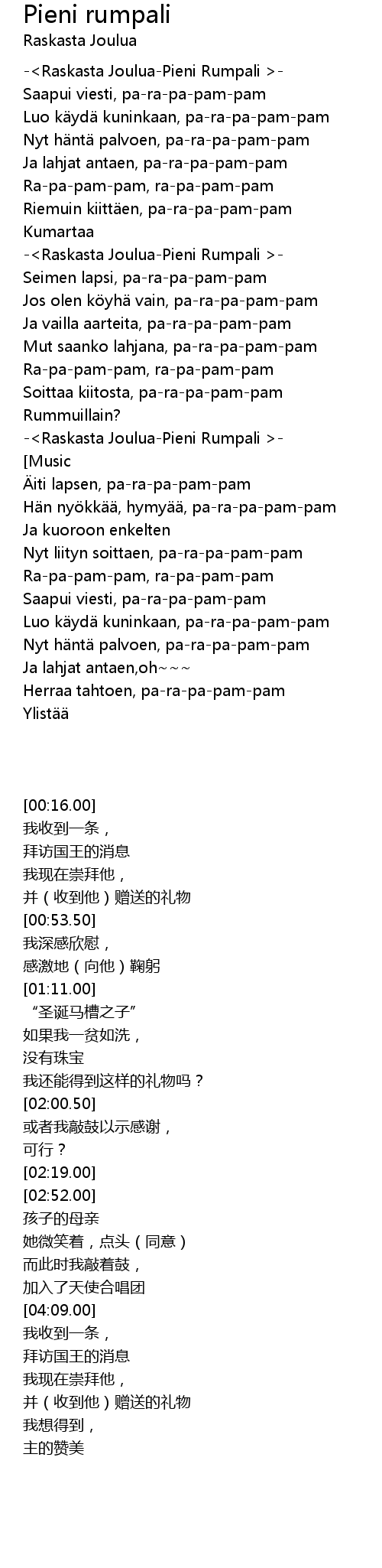| [01:56.40] | Mut saanko lahjana, pa-ra-pa-pam-pam |
