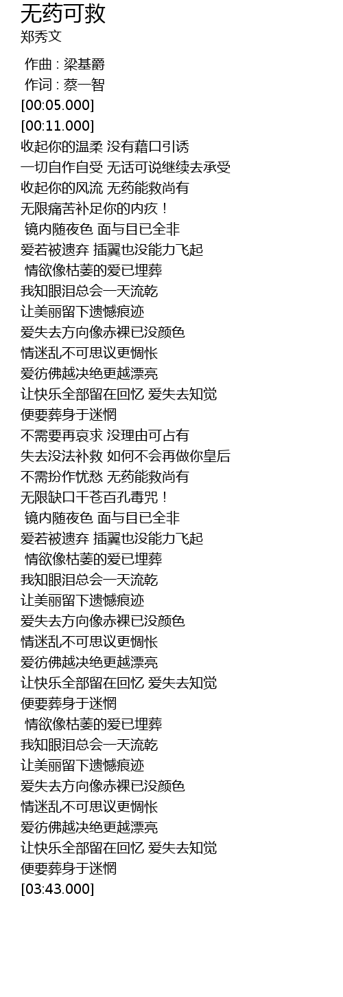 | [02:08.000] | 不需扮作忧愁 无药能救尚有 |