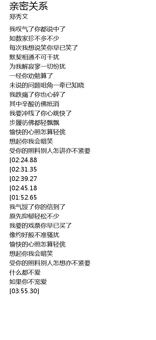 | [03:09.26][02:24.88][01:23.02] | HA...像关系亲密的恋爱 |