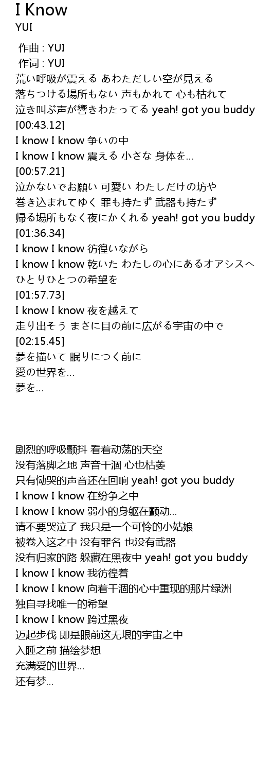 | [01:42.07] | I know I know 乾いた わたしの心にあるオアシスへ |