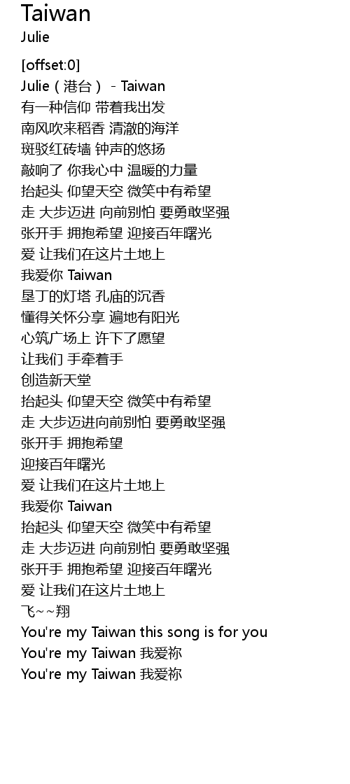 | [04:01.66] | You're my Taiwan 我爱祢 |