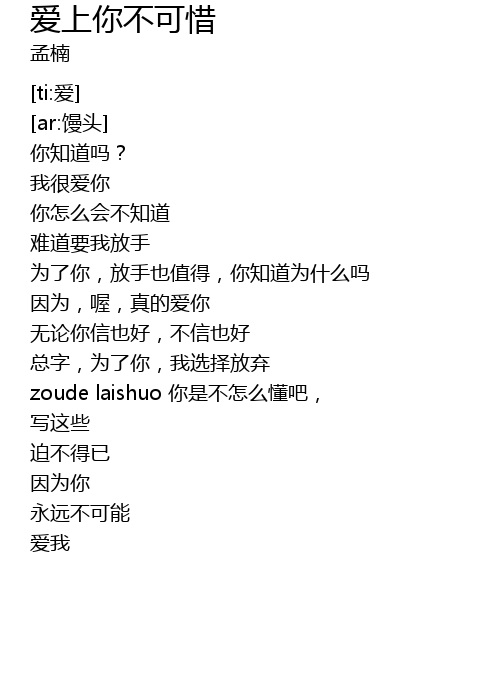 | [00:15.827] | wèi le nǐ, fàng shǒu yě zhí de, nǐ zhī dào wèi shí me ma |