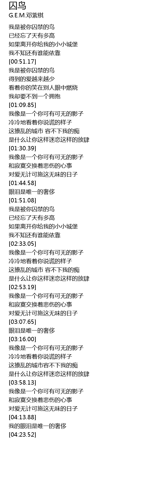 | [00:51.63] | 我是被你囚禁的鸟 |