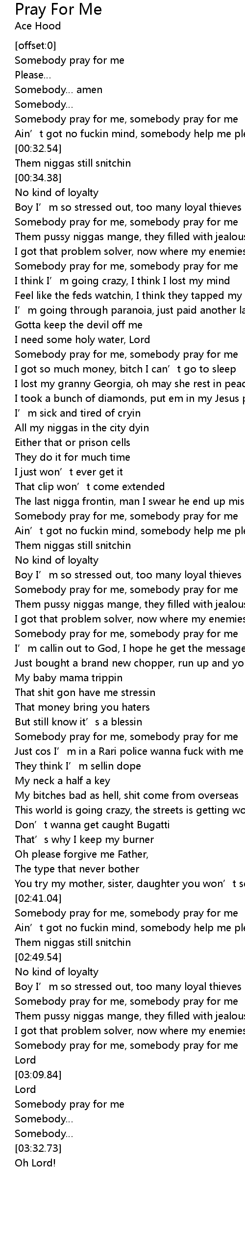| [02:41.66] | Somebody pray for me, somebody pray for me |