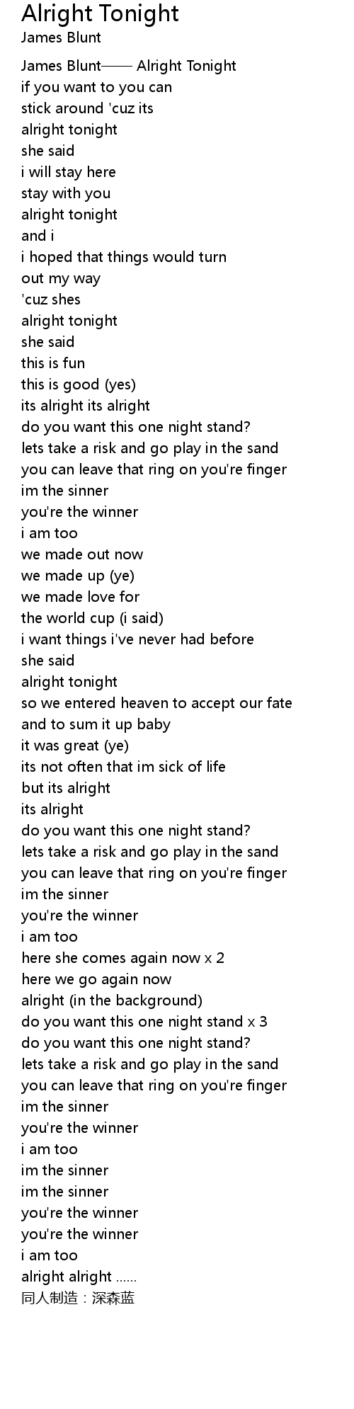 | [00:02.18] | James Blunt—— Alright Tonight |