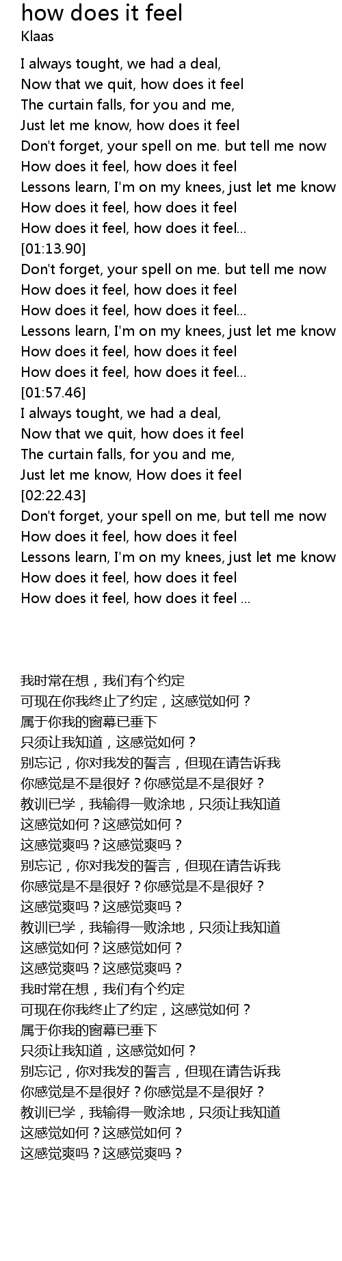 | [01:30.73] | How does it feel, how does it feel |