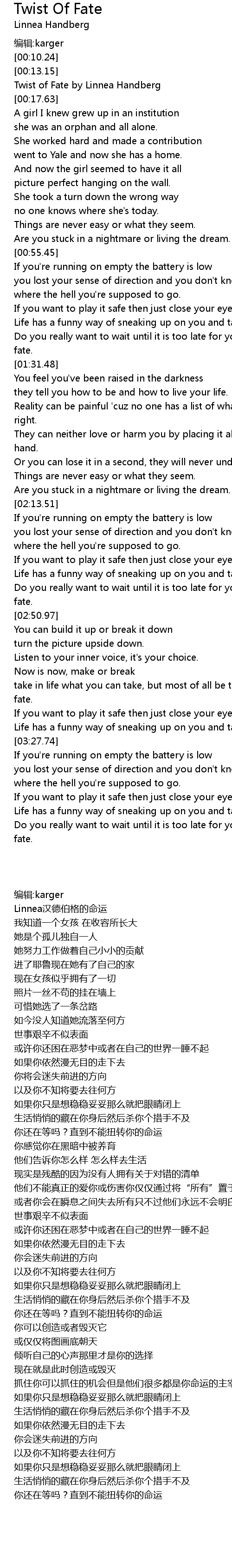 | [00:15.67] | Twist of Fate by Linnea Handberg |