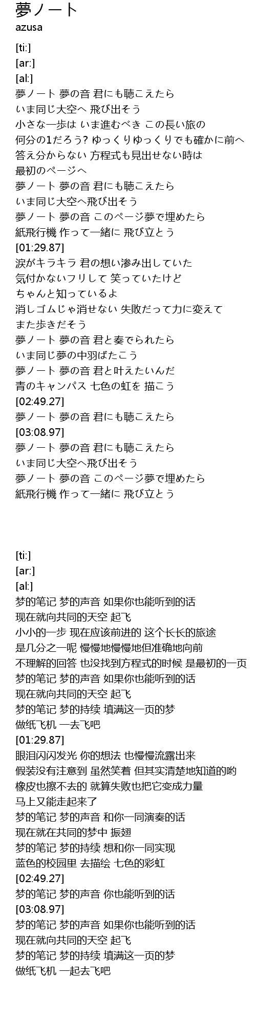 | [02:20.12] | 夢ノート 夢の音 君と奏でられたら いま同じ夢の中羽ばたこう |