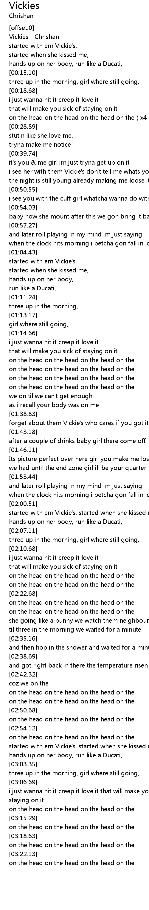| [02:57.72] | started with em Vickie's, started when she kissed me, |