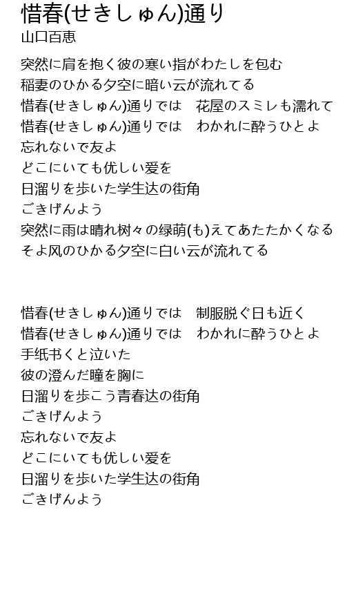 | 惜春(せきしゅん)通りでは わかれに酔うひとよ | |