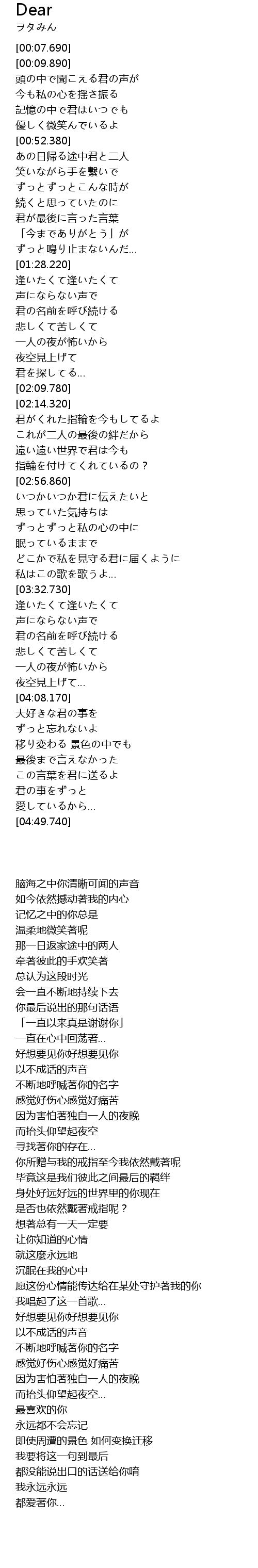 | [02:21.460] | 君がくれた指輪を今もしてるよ |