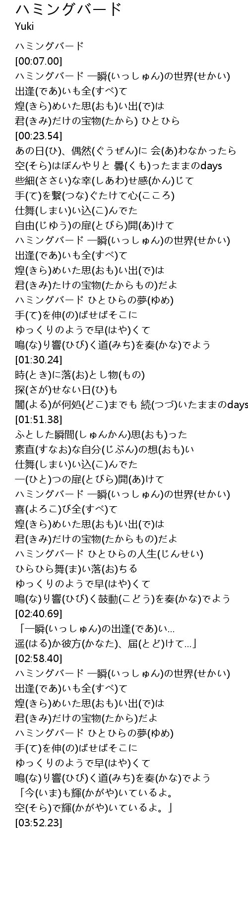 | [02:07.74] | ハミングバード 一瞬(いっしゅん)の世界(せかい) |