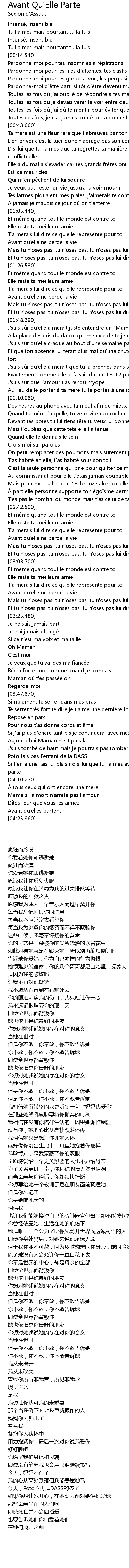| [01:48.900] | J' suis s r qu' elle aimerait juste entendre un " Maman je t' aime" |