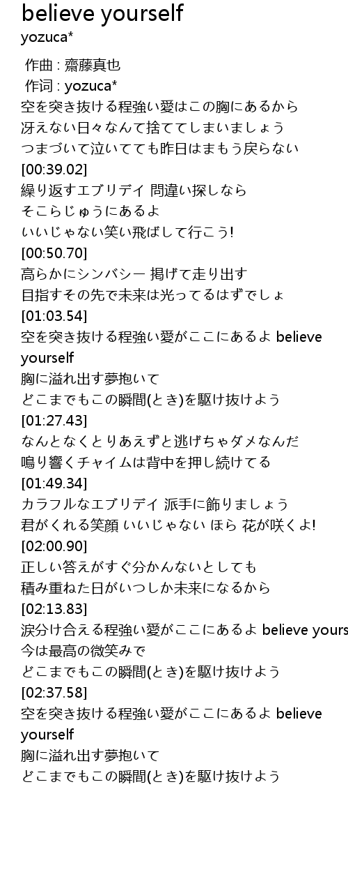 | [02:59.40] | 空を突き抜ける程強い愛がここにあるよ believe yourself |