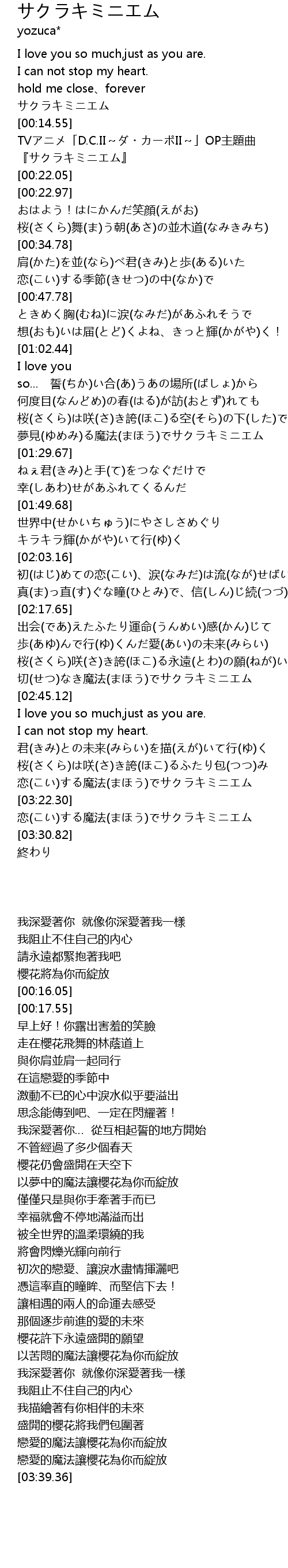 | [02:37.78] | 切(せつ)なき魔法(まほう)でサクラキミニエム |