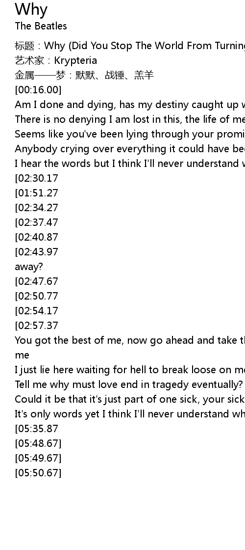 | [00:00.00] | 标题:Why (Did You Stop The World From Turning) |