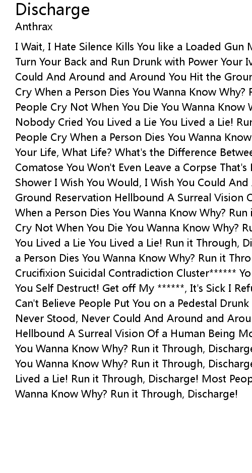 I Wait, I Hate Silence Kills You like a Loaded Gun My Time, You Waste Resolution Turn Your Back and Run Drunk with Power Your Ivory Tower Never Stood, Never Could And Around and Around You Hit the Ground Reservation Hellbound Most People Cry When a Person Dies You Wanna Know Why? Run it Through, Discharge! Most People Cry Not When You Die You Wanna Know Why? Run it Through, Discharge! Nobody Cried You Lived a Lie You Lived a Lie! Run it Through, Discharge! Most People Cry When a Person Dies You Wanna Know Why? Run it Through, Discharge! Your Life, What Life? What's the Difference Between You and Death? Overdose, Comatose You Won't Even Leave a Corpse That's Fresh Drunk with Power Go Take a Shower I Wish You Would, I Wish You Could And Around and Around You Hit the Ground Reservation Hellbound A Surreal Vision Of a Human Being Most People Cry When a Person Dies You Wanna Know Why? Run it Through, Discharge! Most People Cry Not When You Die You Wanna Know Why? Run it Through, Discharge! Nobody Cried You Lived a Lie You Lived a Lie! Run it Through, Discharge! Most People Cry When a Person Dies You Wanna Know Why? Run it Through, Discharge! Self Inflicted Crucifixion Suicidal Contradiction Cluster****** You Load it up Cluster****** You Self Destruct! Get off My ******, It's Sick I Refuse to Feel Sorry for You I Can't Believe People Put You on a Pedestal Drunk with Power Your Ivory Tower Never Stood, Never Could And Around and Around You Hit the Ground Reservation Hellbound A Surreal Vision Of a Human Being Most People Cry When a Person Dies You Wanna Know Why? Run it Through, Discharge! Most People Cry Not When You Die You Wanna Know Why? Run it Through, Discharge! Nobody Cried You Lived a Lie You Lived a Lie! Run it Through, Discharge! Most People Cry When a Person Dies You Wanna Know Why? Run it Through, Discharge! |