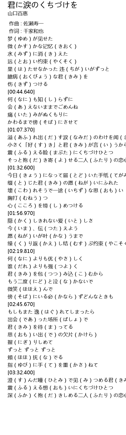 | [03:43.940] | 震(ふる)える想(おも)いにくちづけひとつ |