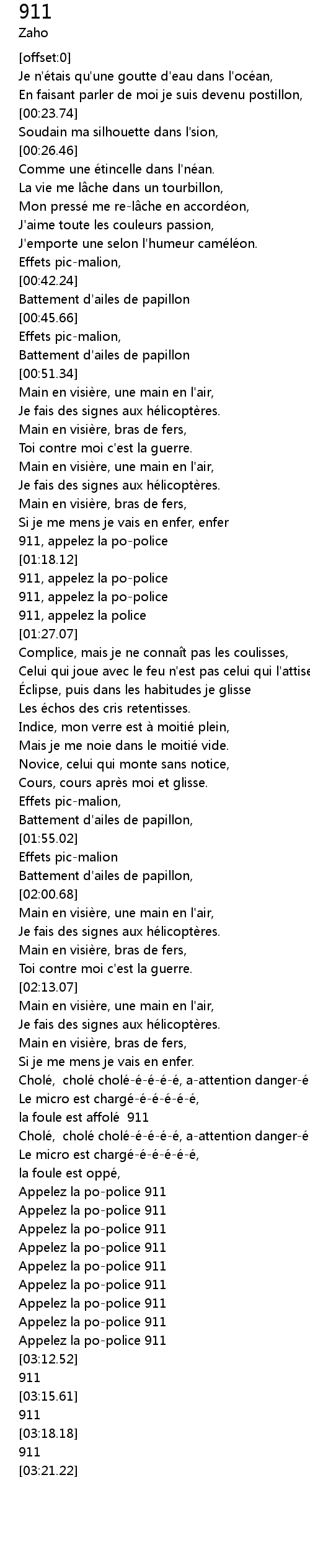 | [01:06.94] | Je fais des signes aux hélicoptères. |