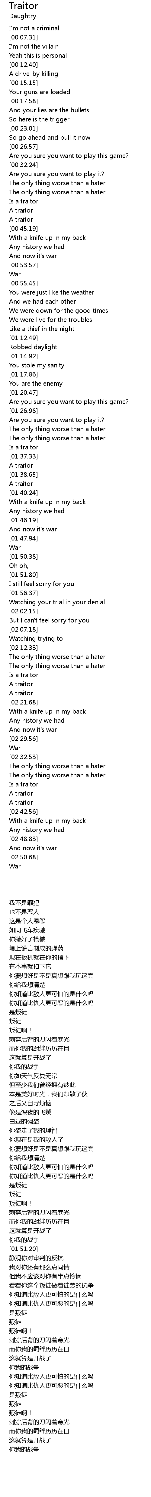 | [02:18.14] | Is a traitor |