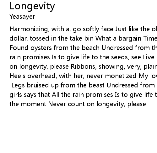 Harmonizing, with a, go softly face Just like the old days Golden, seaplane, dollar, tossed in the take bin What a bargain Time will bear the yellow knife Found oysters from the beach Undressed from the waist My girl says that All the rain promises Is to give life to the seeds, see Live in the moment Never count on longevity, please Ribbons, showing, very, plainly on her skin Okay i want in Heels overhead, with her, never monetized My lovely space case The time done in bed with she [?] Legs bruised up from the beast Undressed from the waist My girls says that All the rain promises Is to give life to the seeds, see Live in the moment Never count on longevity, please |