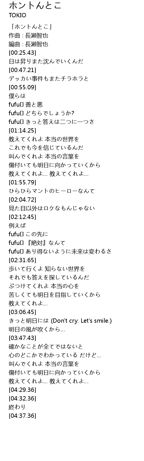 | [03:33.63] | きっと明日には (Don't cry. Let's smile.) |