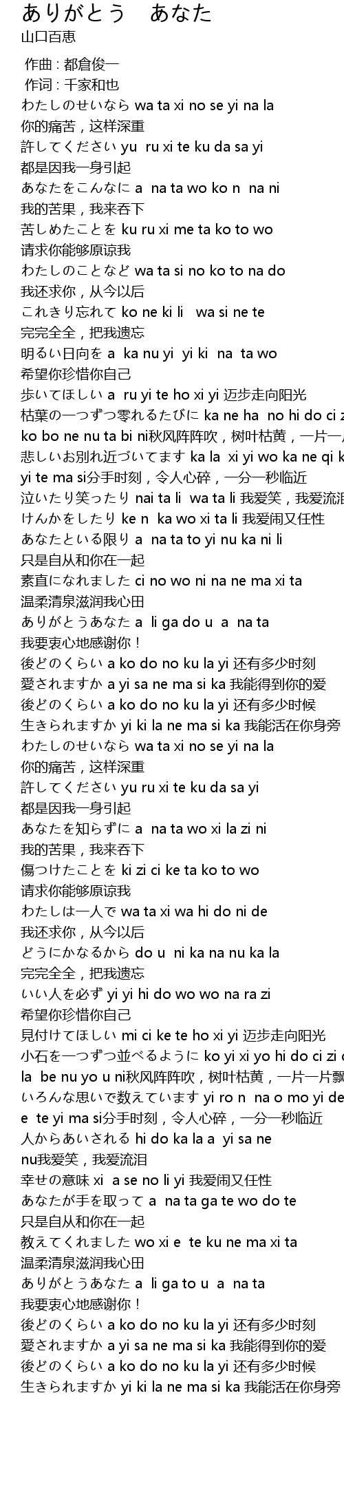 | [01:20.780] | ありがとうあなた a li ga do u a na ta 我要衷心地感谢你! |