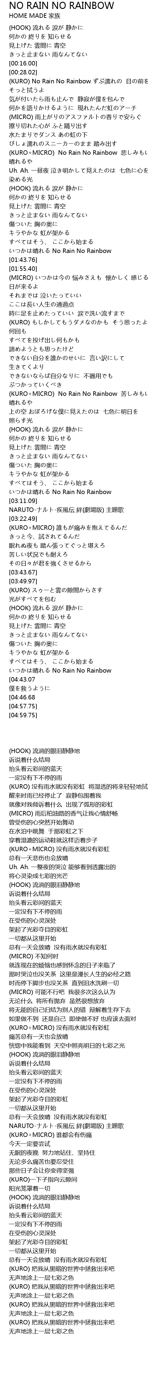 | [00:59.40] | (KURO+MICRO) No Rain No Rainbow 悲しみもいつかは 晴れるや |