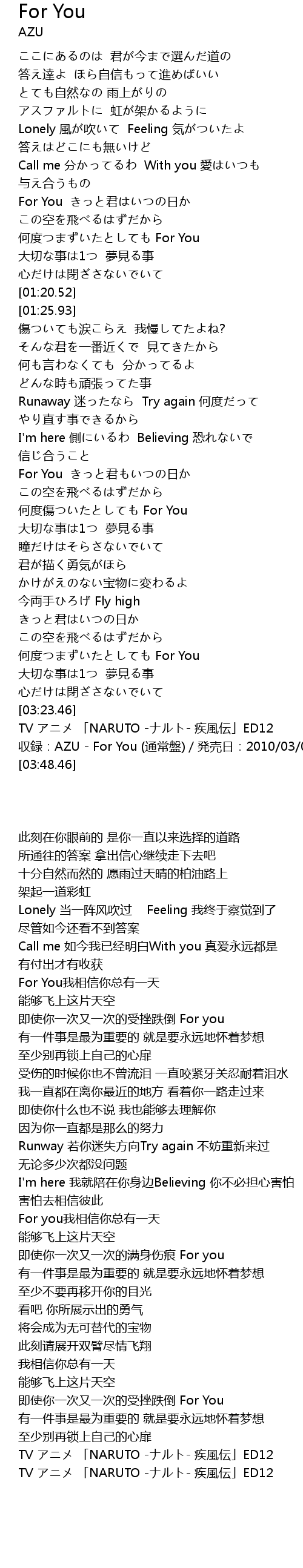 | [03:39.46] | shōu lù: AZU For You tōng cháng pán fā mài rì: 2010 03 03 |
