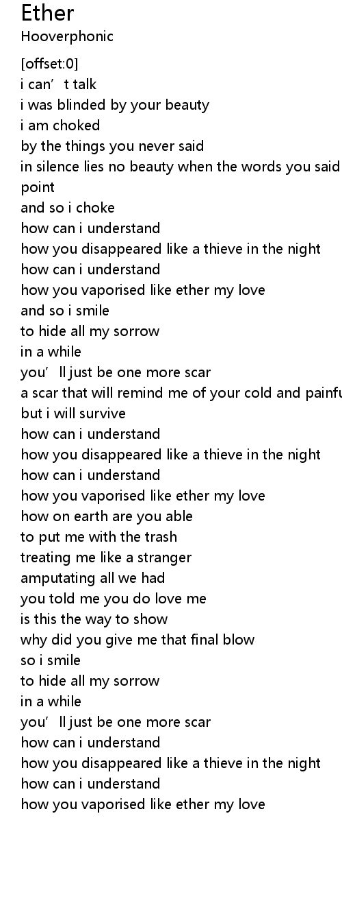 | [01:36.30] | how you vaporised like ether my love |