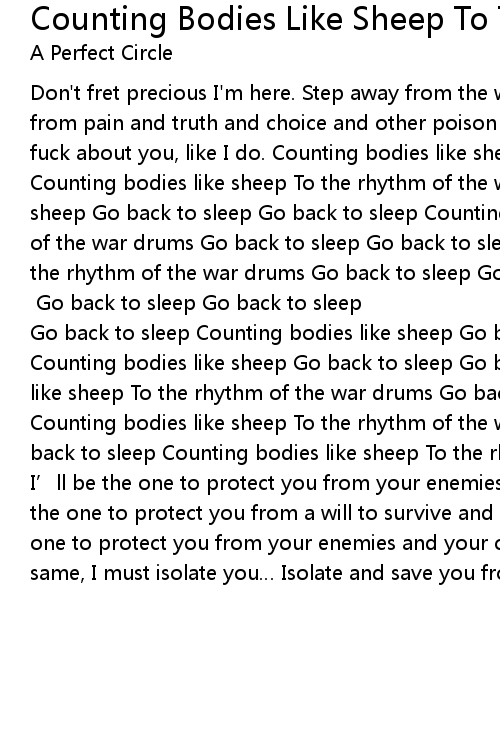 | Don' t fret precious I' m here. Step away from the window. Go back to sleep Safe from pain and truth and choice and other poison devils, See, they don' t give a fuck about you, like I do. Counting bodies like sheep Counting bodies like sheep Counting bodies like sheep To the rhythm of the war drums Counting bodies like sheep Go back to sleep Go back to sleep Counting bodies like sheep To the rhythm of the war drums Go back to sleep Go back to sleep Counting bodies like sheep To the rhythm of the war drums Go back to sleep Go back to sleep Counting bodies like sheep Go back to sleep Go to sleep x14 Go back to sleep Go back to sleep Go back to sleep Counting bodies like sheep Go back to sleep Go back to sleep Counting bodies like sheep Go back to sleep Go back to sleep Counting bodies like sheep To the rhythm of the war drums Go back to sleep Go back to sleep Counting bodies like sheep To the rhythm of the war drums Go back to sleep Go back to sleep Counting bodies like sheep To the rhythm of the war drums x2 I' ll be the one to protect you from your enemies and all your demons I' ll be the one to protect you from a will to survive and a voice of reason I' ll be the one to protect you from your enemies and your choices son They' re one in the same, I must isolate you Isolate and save you from yourself |
