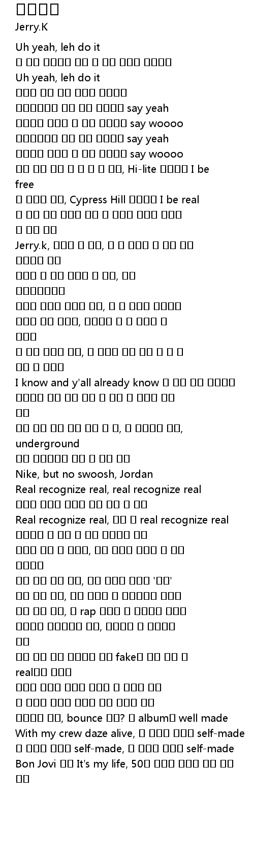 | [00:57.70] | 늘 진짜만 뱉지, Cypress Hill 아니지만 I be real |