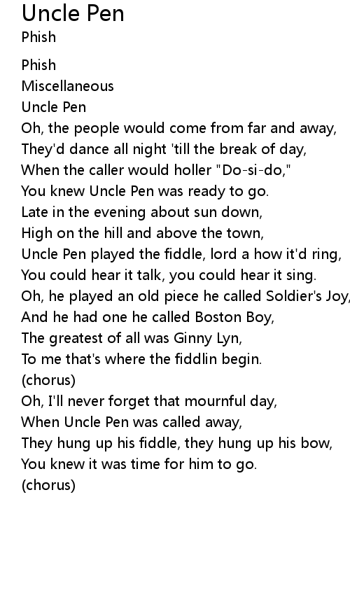 Uncle Pen played the fiddle, lord a how it'd ring, |