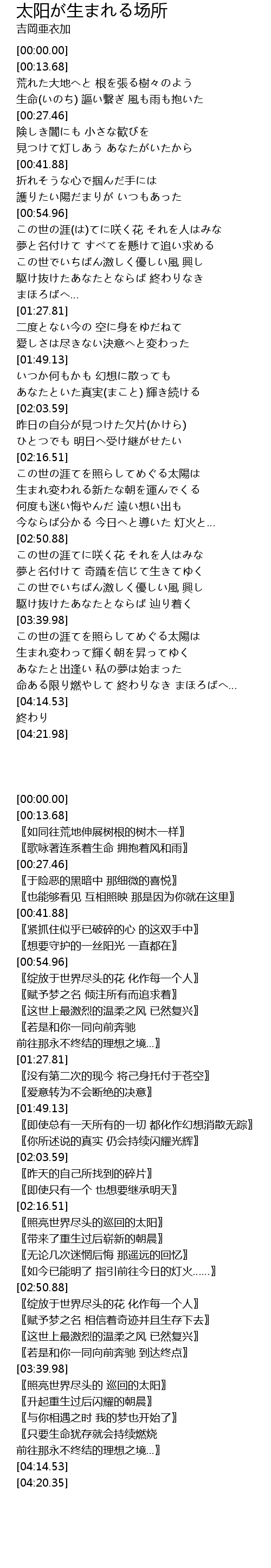 | [00:21.16] | 生命(いのち) 謳い繋ぎ 風も雨も抱いた |