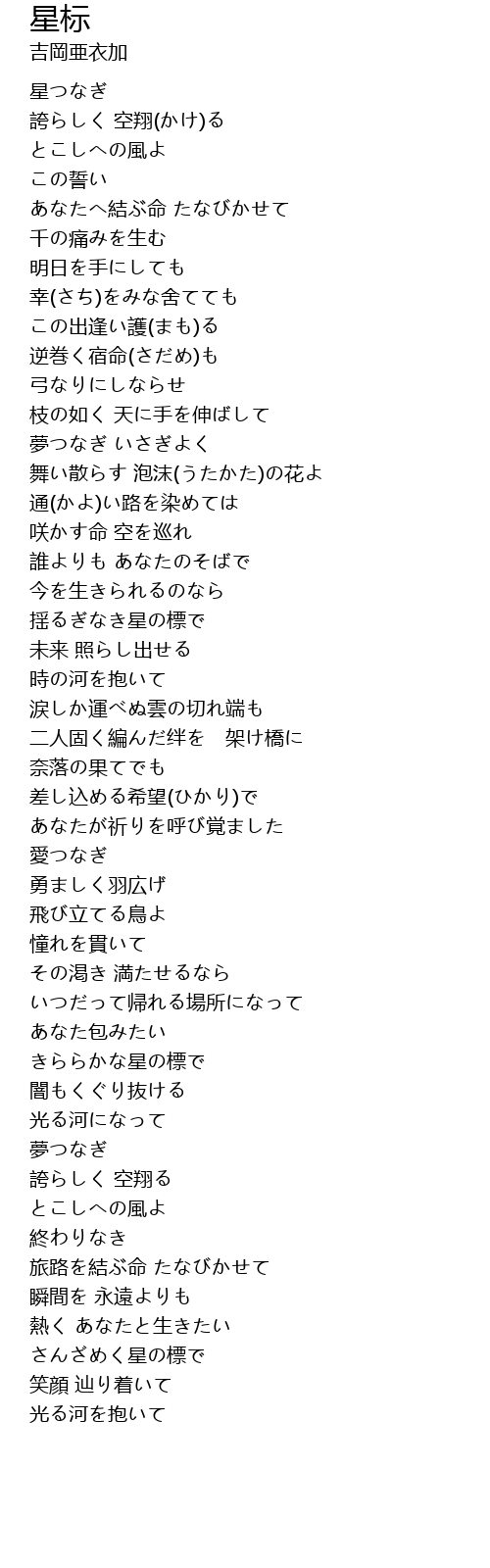 | [00:10.57] | あなたへ結ぶ命 たなびかせて |