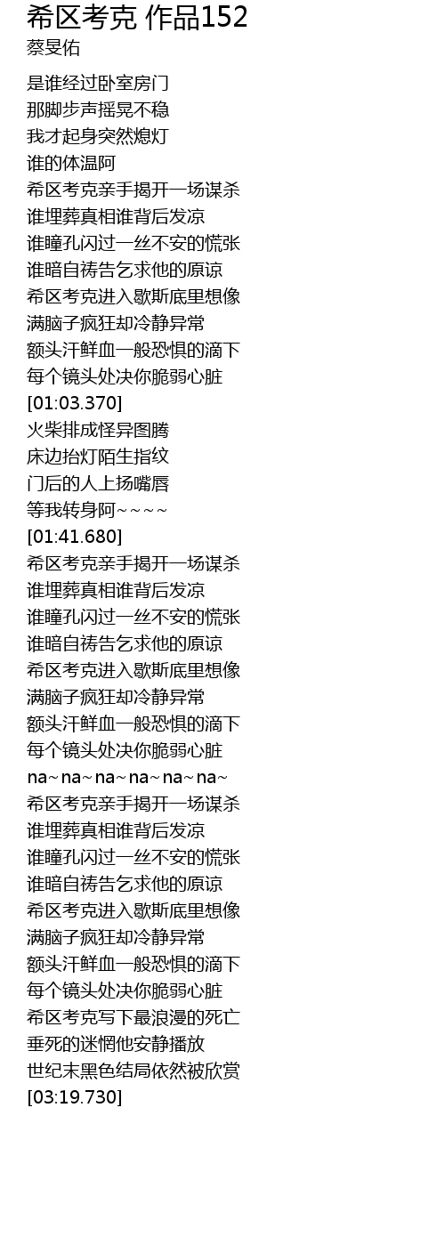 | [02:45.829] | xī qū kǎo kè qīn shǒu jiē kāi yī chǎng móu shā |