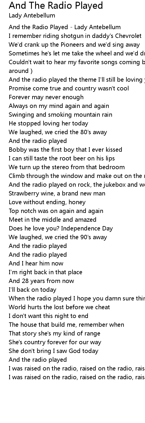 | [00:00.310] | And the Radio Played - Lady Antebellum |
